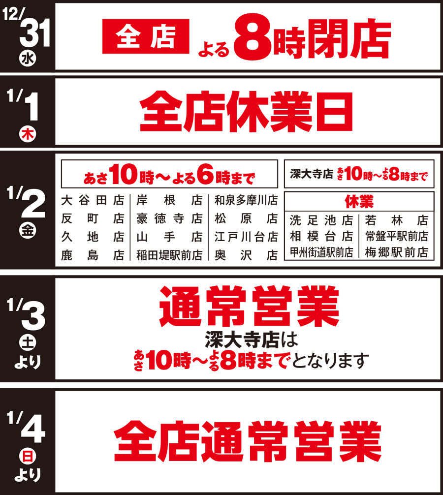 平素よりトップをご利用いただき誠にありがとうございます。年末年始の営業内容についてご案内申し上げます。皆様のご来店、心よりお待ちしております。